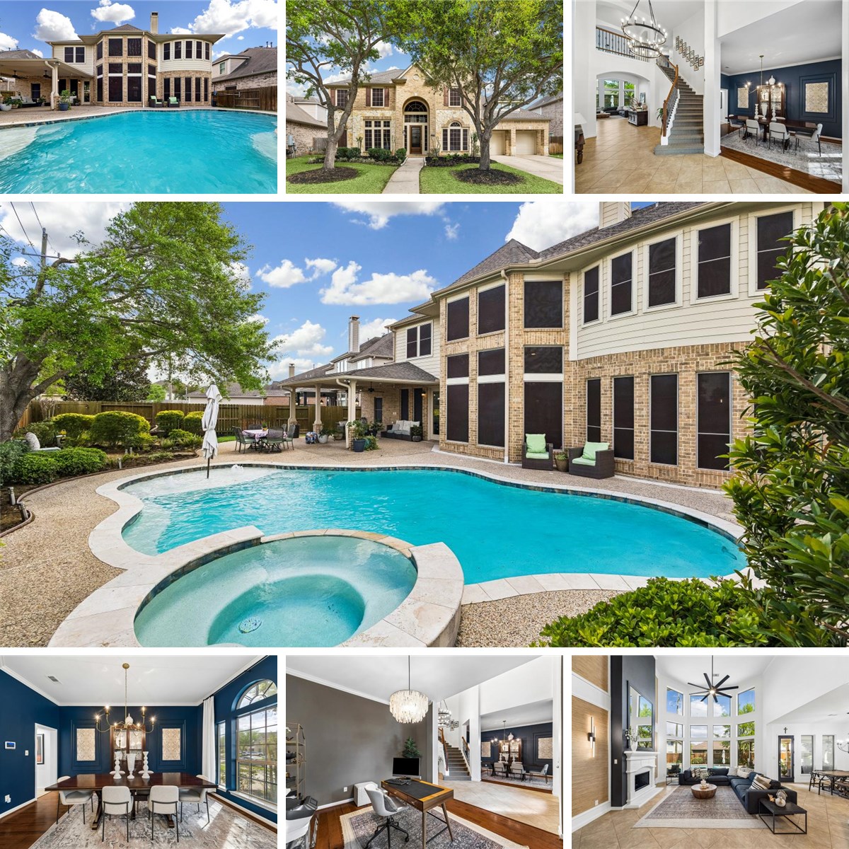 Behind the gates of Old Orchard, mature oaks frame a two-story brick estate reimagined with designer finishes. A soaring foyer with wrought iron staircase opens to a navy-walled formal dining room and private study. The showpiece family room features floor-to-ceiling windows overlooking the pool, a custom fireplace wall with grasscloth accents, and a second-floor overlook. The chef's kitchen showcases dark cabinetry, quartz countertops, waterfall island, gas cooktop, double ovens, and gold hardware. The first-floor primary suite opens to a spa-caliber bath with freestanding soaking tub, glass-enclosed rain shower, hex tile floors, and dual vanities with brass fixtures. A separate first-floor guest suite includes an accessible roll-in shower bath with floor-to-ceiling subway tile. Upstairs: game room, four bedrooms, and two full baths. The backyard is a private retreat with an in-ground pool, attached spa, covered patio, and mature landscaping on a quarter-acre lot.