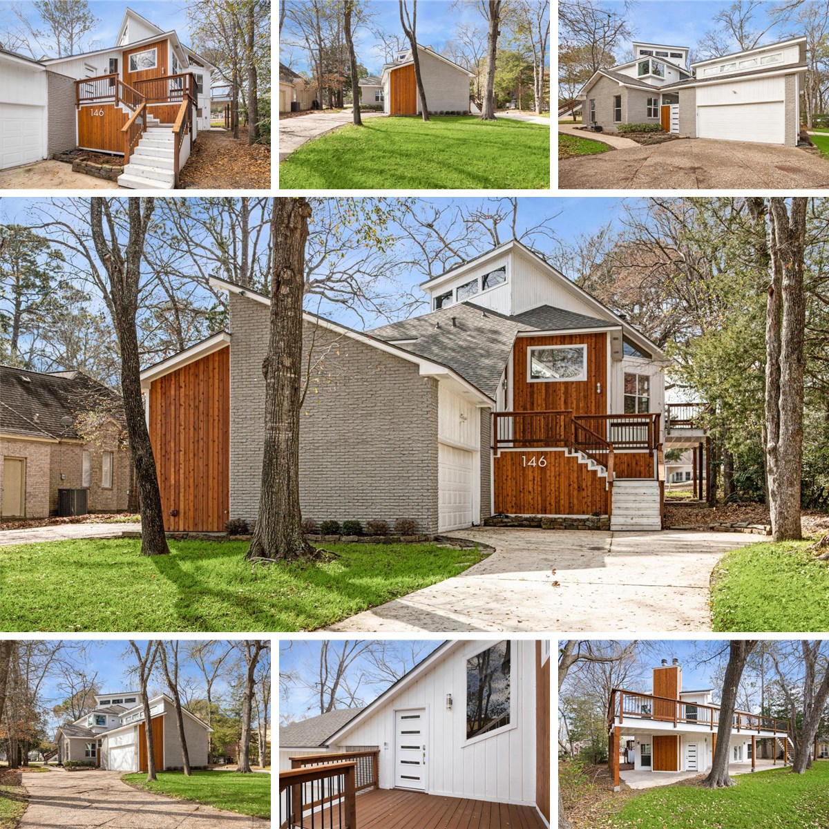 146 Dawns Edge - a unique home with a contemporary design & golf course location in a manned gate community. The split level design provides lower level bedrooms. Primary has wood-burning F/P, en-suite bath w/separate oversize shower, garden tub & W/I closet. All bedrooms have access to the lawn and lower level deck. The open concept upper level has golf course view from the expansive family room w/soaring ceiling & W/B F/P, dining area, breakfast area and huge kitchen w/curved breakfast/serving bar. Kitchen has slab granite counter tops, tile backsplash with accent, extensive cabinets, double corner window & 2nd sink. Upper level balcony overlooks the golf course. Features inc: recent laminate flooring, fresh paint, updated lighting, sound proof game room with mini-split & recent roof. Bath 2 has oversize shower w/tile surround, granite topped vanity & updated lighting and mirror. Community offers, country with 3 nine hole golf courses, tennis courts, 40 slip marina with Lake Conroe access & area pool.