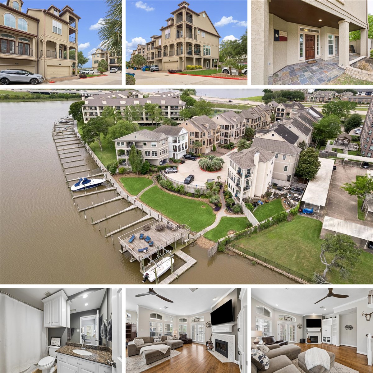 A boat lovers dream is to own this beautiful town home located at this incredible location off of Clear Lake. A boat slip can be available to walk down and hop on your boat right outside the back door, enjoying daily sunrises and sunsets off of the water. This home offers privacy situated on the corner with easy access in and out of the complex. Enter the large foyer by garage or front door where one bedroom with en suite bathroom exists. The second floor boasts an open floor plan with high ceilings, spacious den that over looks the balcony allowing natural light in. The large kitchen offers ample storage, and granite countertop space that over looks the formal dining area and den, perfect for the flow of entertaining and use. The side area can be used as a breakfast room, bar area, or small study.The 3rd floor offers the primary bedroom,lux bath,and Lg walk-in closet, and a 3rd bedroom w/ en suite bath.Two balconies from primary with one up a spiral staircase offering a higher view