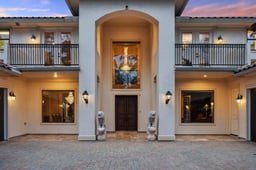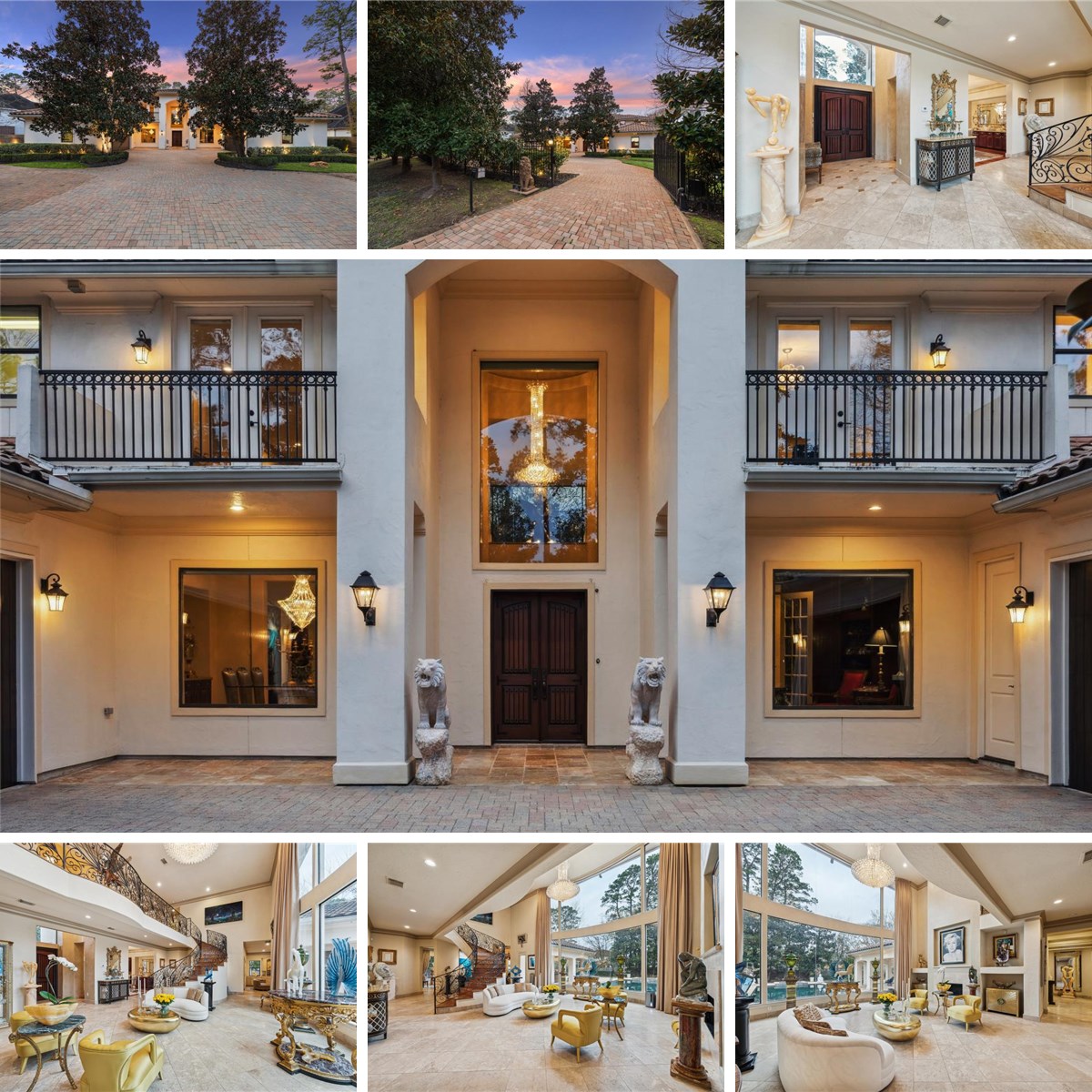 Stately Mediterranean estate on a private, tree-lined lot featuring a sweeping brick motor court and grand double-door entry. This 5-bedroom, 5.5-bath residence showcases soaring ceilings, dramatic floor-to-ceiling windows, marble floors, rich hardwoods, and elegant wrought-iron detailing. Expansive formal and casual living areas flow seamlessly into a chef’s kitchen with custom cabinetry and large island. The private primary wing offers a luxurious retreat with spa-like bath and his and hers closets. Upstairs includes spacious bedrooms, game room, and utility. Resort-style backyard with heated pool, spa, covered patios, and outdoor kitchen completes this exceptional home designed for refined living and effortless entertaining.