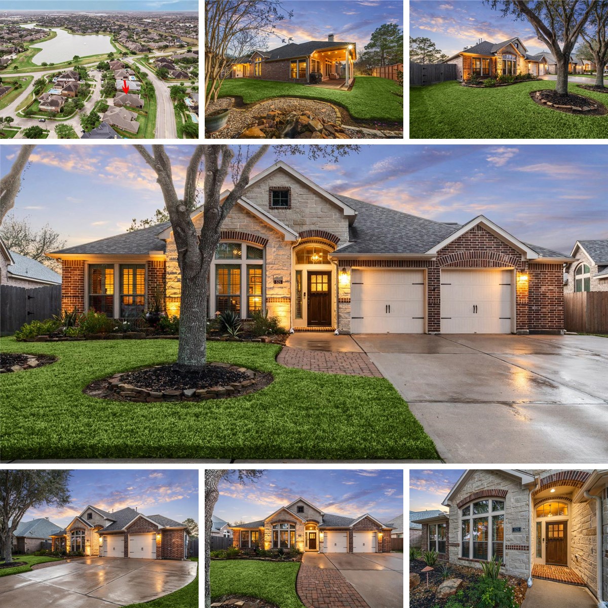 Enjoy resort-style living in the sought-after community of South Shore Harbor! This ALL brick and stone one-story home by quality builder "Perry Homes" is situated on a quiet cul-de-sac street with serene lake views. Drive up to a meticulously manicured lawn with an extended driveway for extra parking. The flexible open floor plan offers 4 bedrooms, 3 baths, study and game room. Features include high ceilings, DBL crown molding, plantation shutters, tile and wood flooring. Chef's kitchen with large granite island, wood cabinetry, SS appliances and gas stove. Living room with warm fireplace open to eat-in kitchen. Owner's retreat with huge closet and ensuite bath. Secondary bedrooms down private halls. Peaceful backyard with covered patio and tranquil rock fountain feature. Neighborhood amenities include a tennis court, pool, pool house, multiple playgrounds and lakes, and miles of bike/walking trails. Ideally located with quick access to I-45 and I-46 and within walking distance to restaurants & shopping!